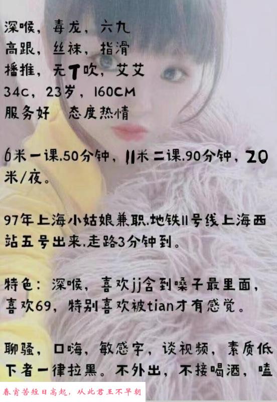无意间加到欢儿老师的联系方式,看了下本帮菜,课表项目又刚刚好这口,迫不及待的约了时间,到地方上楼,地方好找,见面还不错,个子不高158左右,说着上海话听口音确定本地人,洗完澡开始服务走流程,做到后面成了我服务她了,给她舔的很舒服的样子,便爬上来舌吻一会,套都没来得及带直接上阵,之后完事她高潮一脸享受的样子,变成了她嫖我,让我满足了她,觉得十分有成就感,后面聊天了解到欢儿老师是兼职,平常在地铁站上班检票,开课时间不定的,总的来说6张不错,老师特别放得开,课表项目有特色,贴图在下面