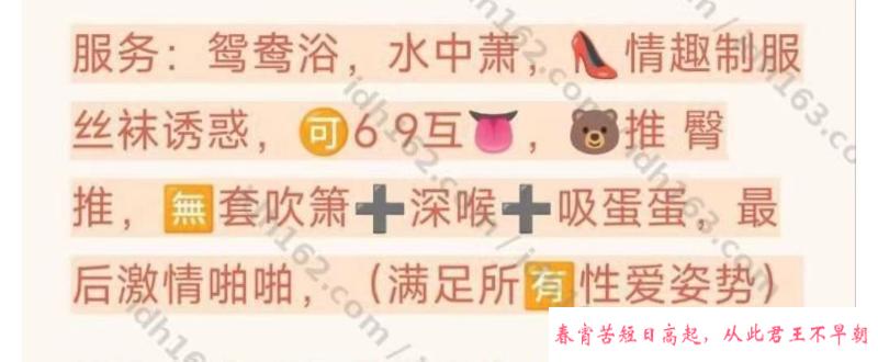 服务项目: 鸳鸯浴、水中箫、情趣制服丝袜诱惑、69、胸推、臀推、吹箫、深喉、吸蛋、啪啪